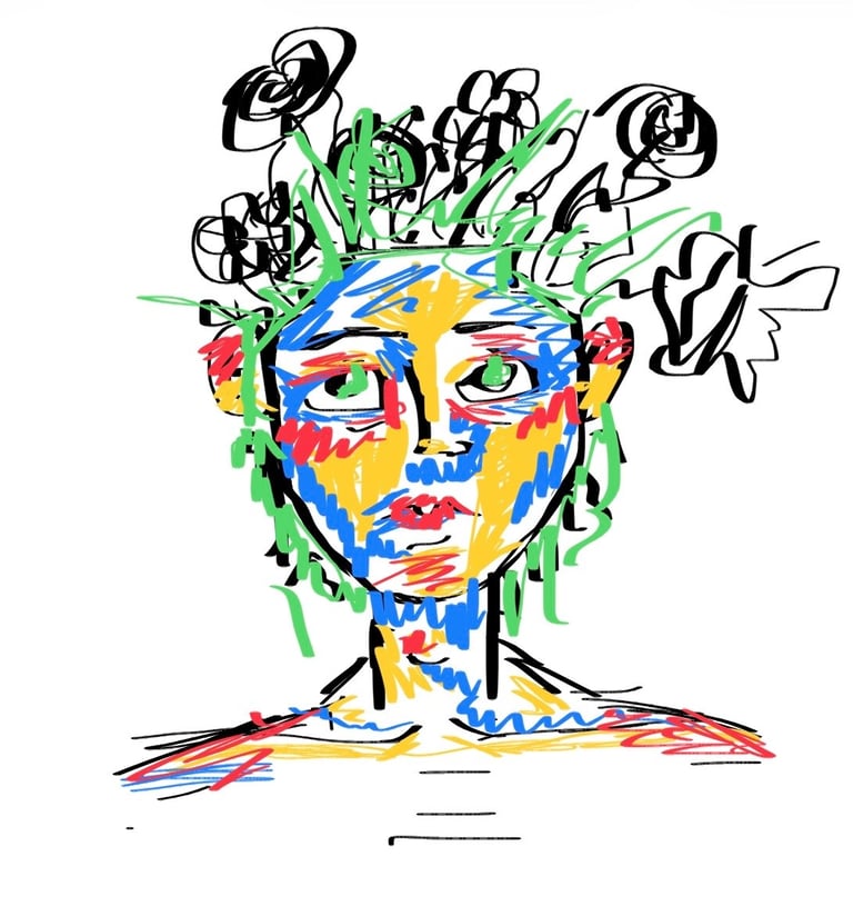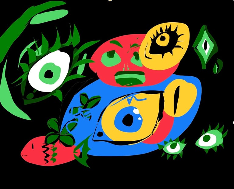 La première œuvre, "Dispute sous le soleil ", est mon premier dessin numérique terminé. Elle utilise des aplats de couleurs primaires et secondaires sur un fond noir afin de faire ressortir des couleurs vives évoquant l’été et les moments familiaux. Les yeux multicolores symbolisent le regard et le jugement des autres lors d’une dispute dans un lieu public.