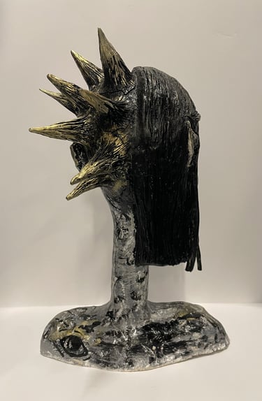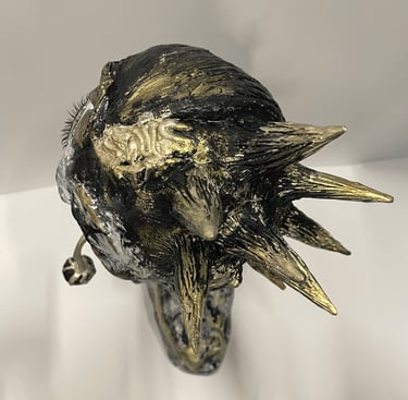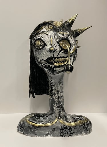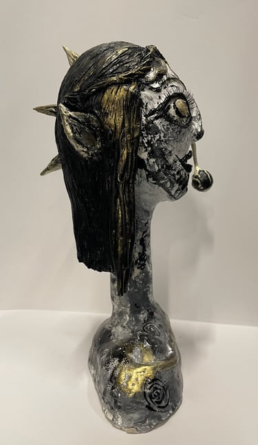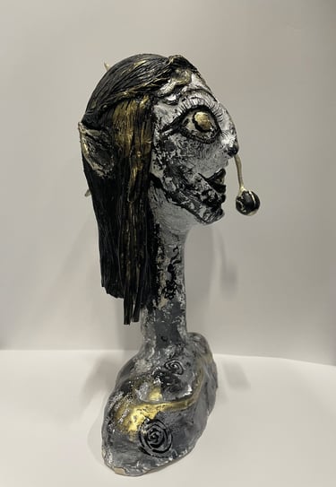 Sculpture faite d'argile, de peinture acrylique, de colle (chaude), de faux cils, de vernis, de carton, d'aluminium ainsi que scotch et de poudre chromée.